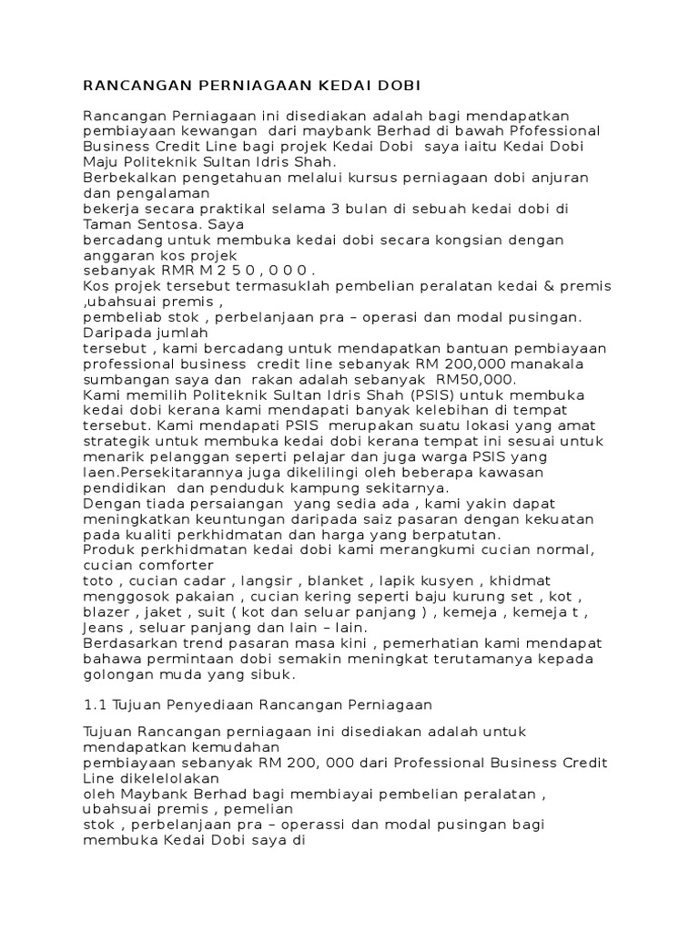 Pemasaran adalah beberapa siri aktiviti perniagaan yang direka bentuk untuk memuaskan keperluan dan kehendak pengguna dan pada masa yang sama memberi keuntungan. 1 kedai dobi layan diri self service saya terjumpa iklan mengenai kedai dobi ini ketika sedang mencari maklumat di google. 5 3 keperluan bahan sebulan jenis bahan kuantiti harga unit rm jumlah rm tepung gandum 50 kg rm 1 20 rm 60 00 tepung naik sendiri 40 kg rm 2 70 rm 108 00 telur ayam 100 biji rm 0 25 rm 25 00 mentega 50 kg rm 2 50 rm 125 00 serbuk koko 30 botol rm 0 80 rm 24 00 soda bikarbonat 30 botol rm 1 00 rm 30 00 susu segar.