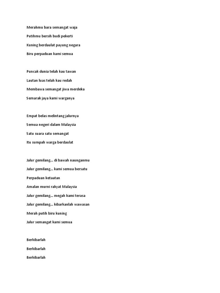 Lirik Lagu Jalur Gemilang Merahmu Bara Semangat Waja Putihmu Bersih Budi Pekerti Kuning Berdaulat Payung