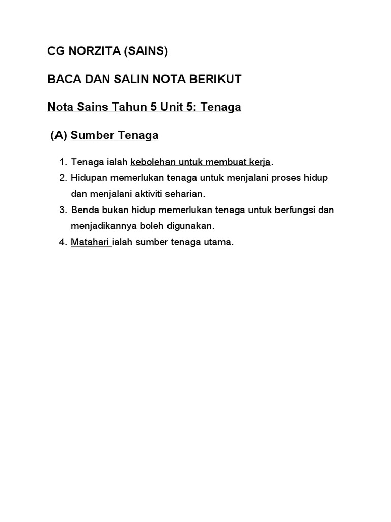 A Sumber Tenaga Nota Unit 5 Tenaga Sains Tahun 5
