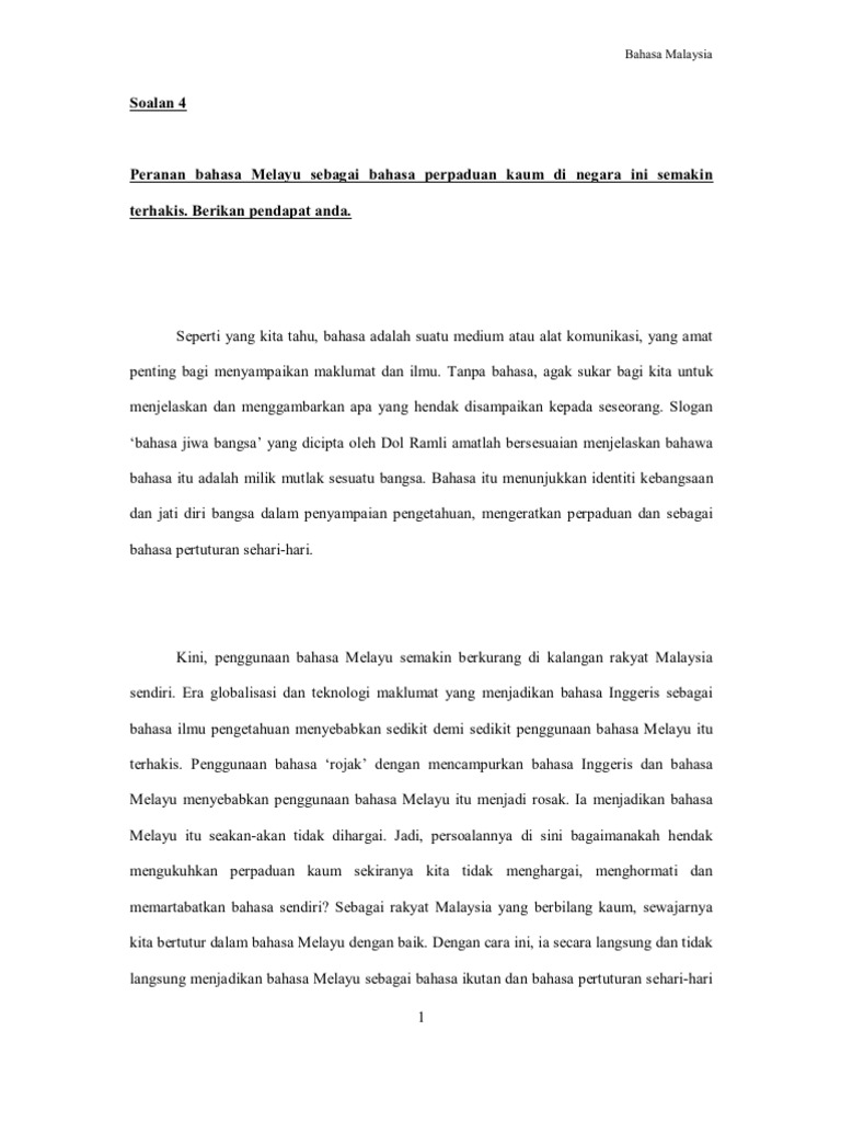 Peranan Bahasa Melayu Sebagai Bahasa Perpaduan Kaum Di Negara Ini Semakin Terhakis